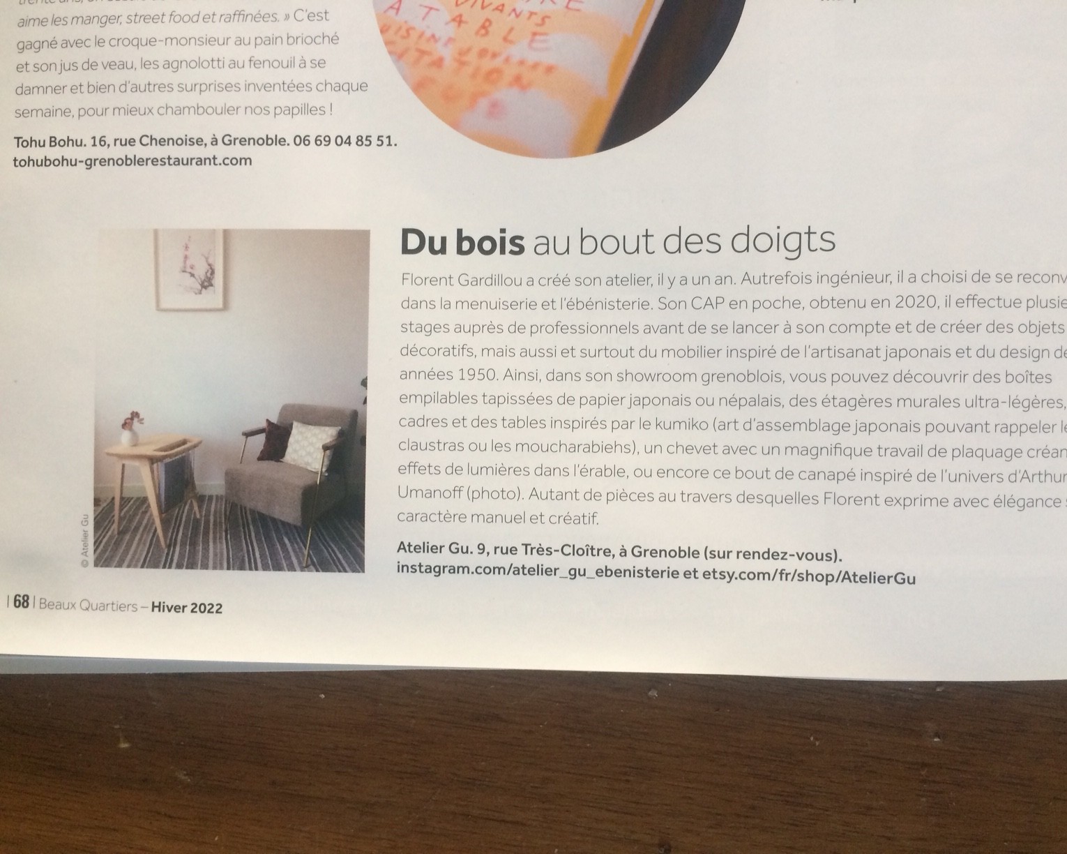 L’Atelier Gu Ebénisterie, installé à Fontaine, dans l’agglomération grenobloise, est né de cette volonté de concevoir et de réaliser du mobilier haut de gamme avec des lignes simples et une esthétique marquée et remarquable. Particulièrement inspiré par le design des années 1950, j’aime rehausser mes créations de motifs de décorations, inspirés de savoir-faire ancestraux comme la marqueterie ou l’art japonais du kumiko. Chaque pièce est pensée comme une pièce unique : choix de l’essence de bois,