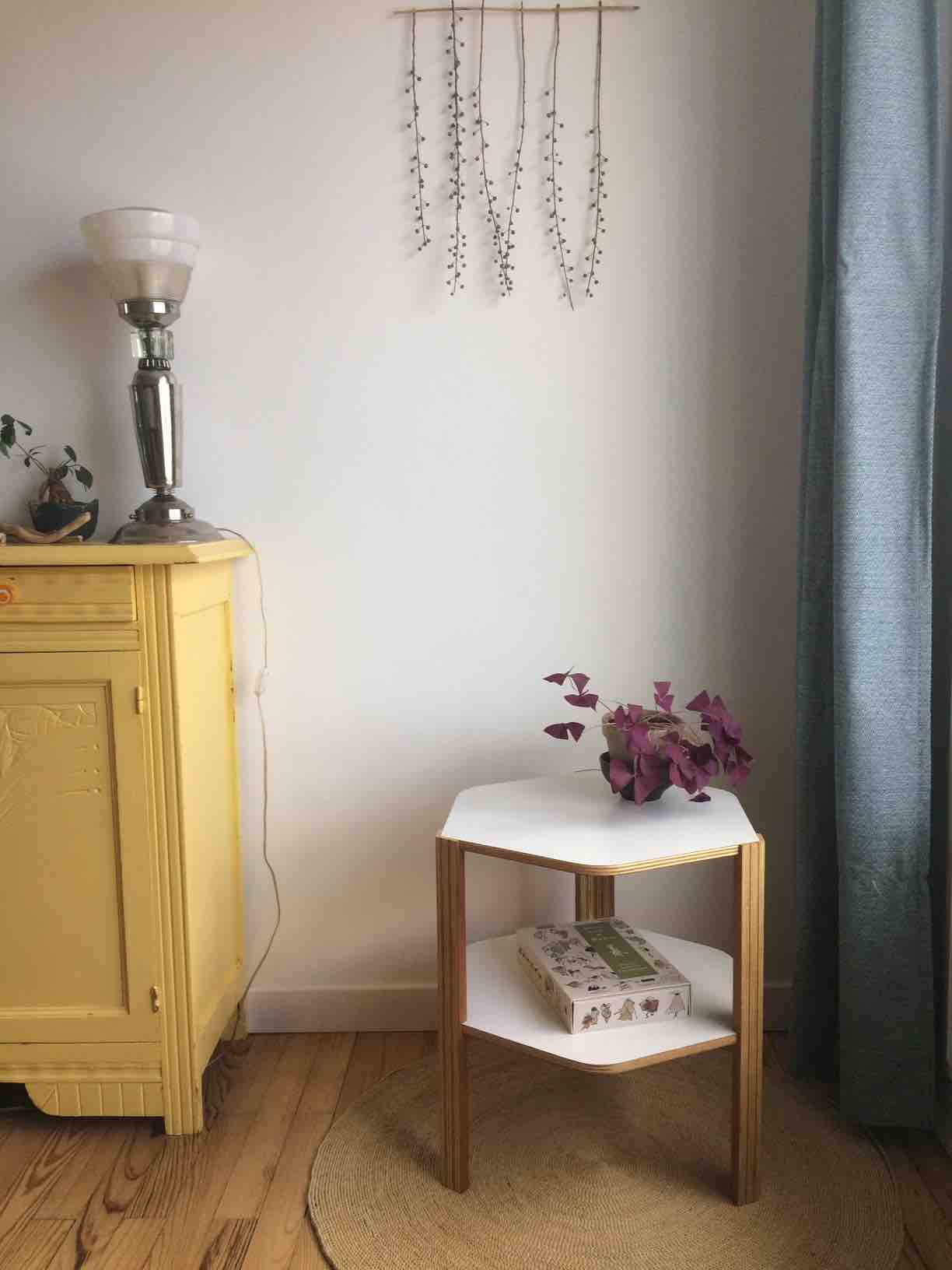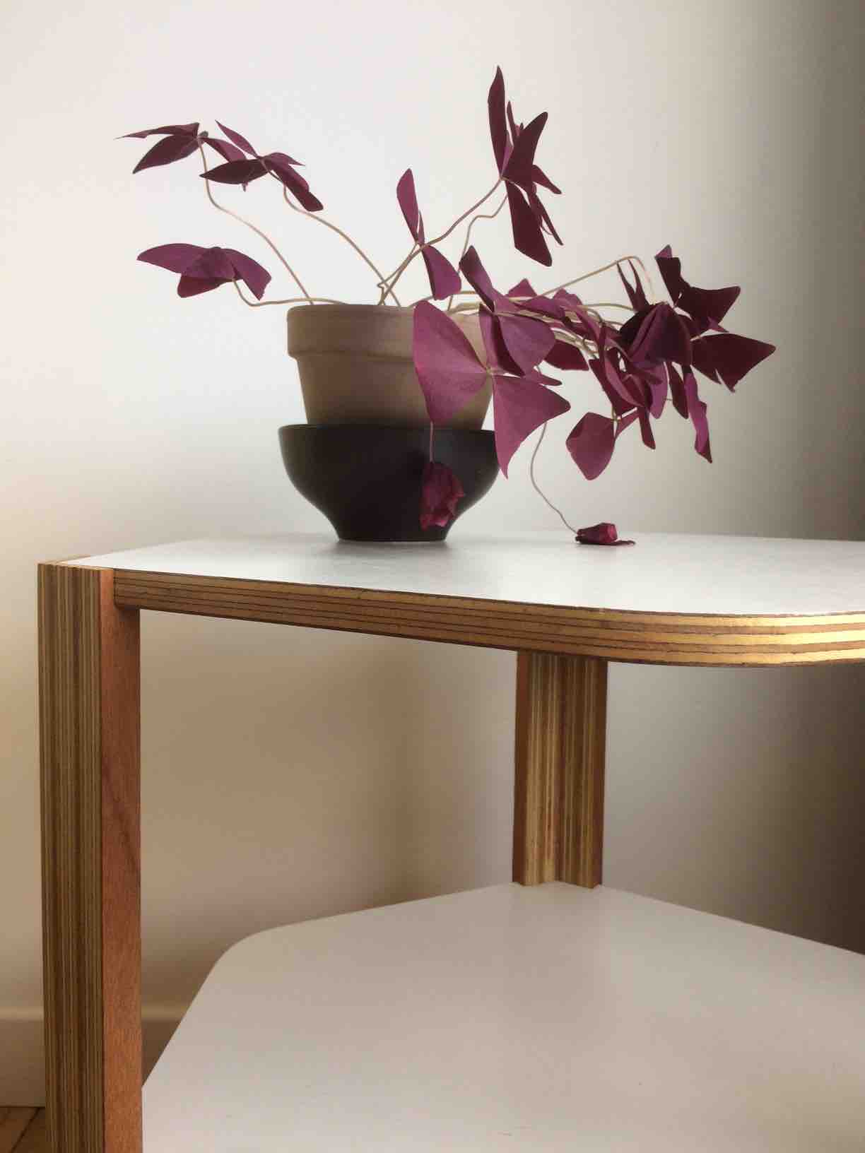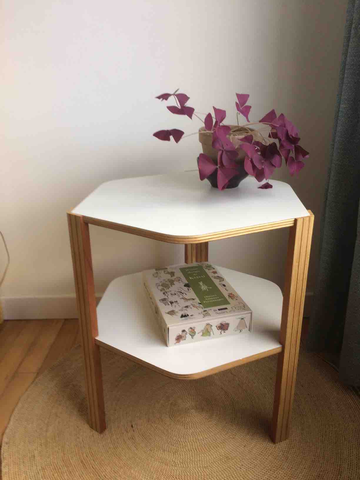 Une de mes premières créations. Une petite table basse d’appoint entièrement réalisée en contreplaqué. La surface des plateaux est laquée blanc alors que les pieds et les chants des plateaux sont finis à l’huile de lin. La forme hexagonale des plateaux a été adoucie en arrondissant un angle sur deux.