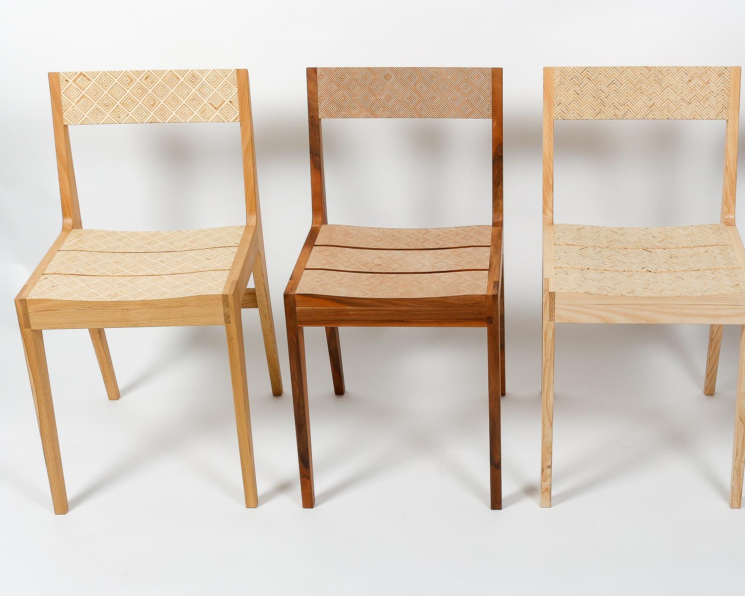 L’envie de départ était de proposer un ensemble de chaises dépareillées mais homogènes ; un modèle identique mais dans des essences et avec des décors différents de manière à ce que chacune, unique, appelle l’autre.