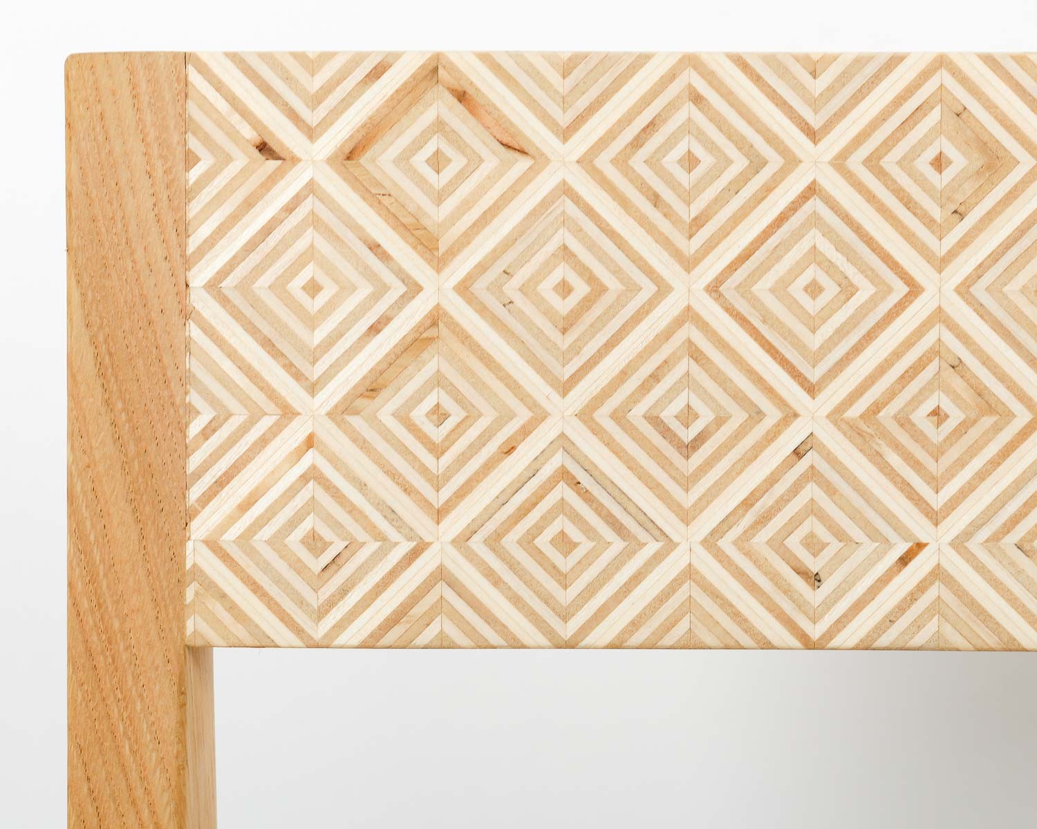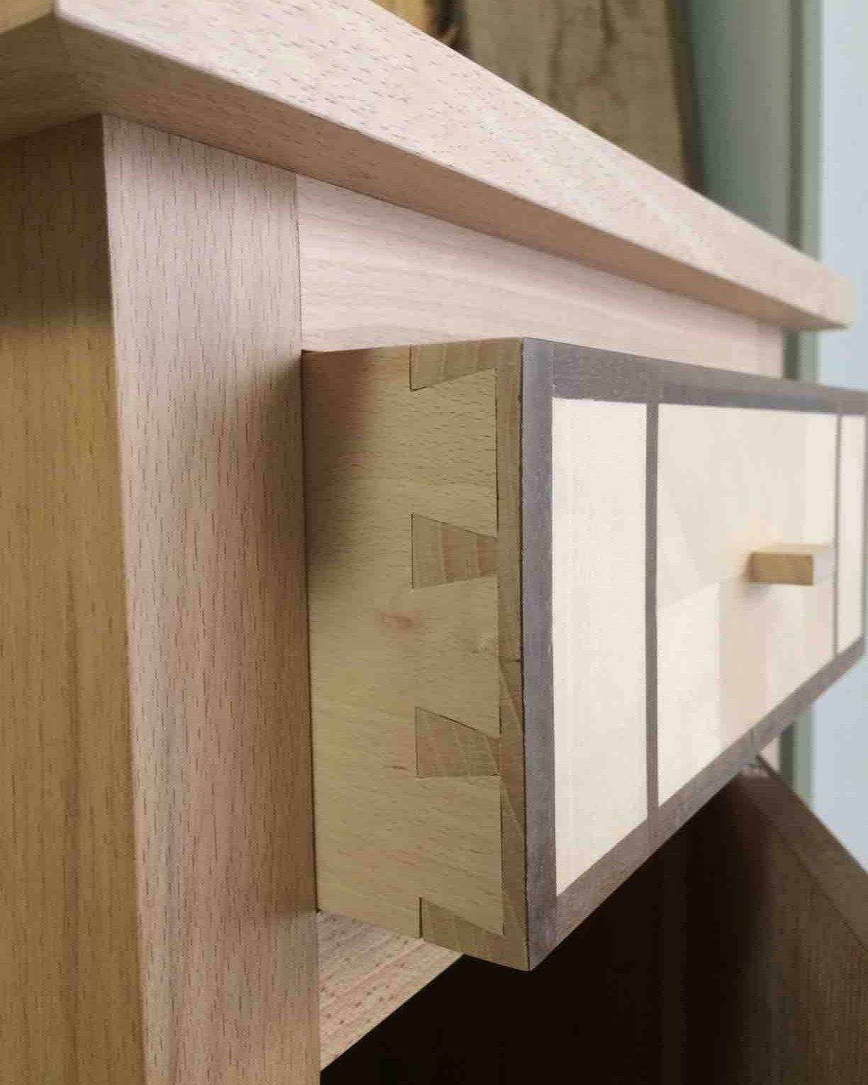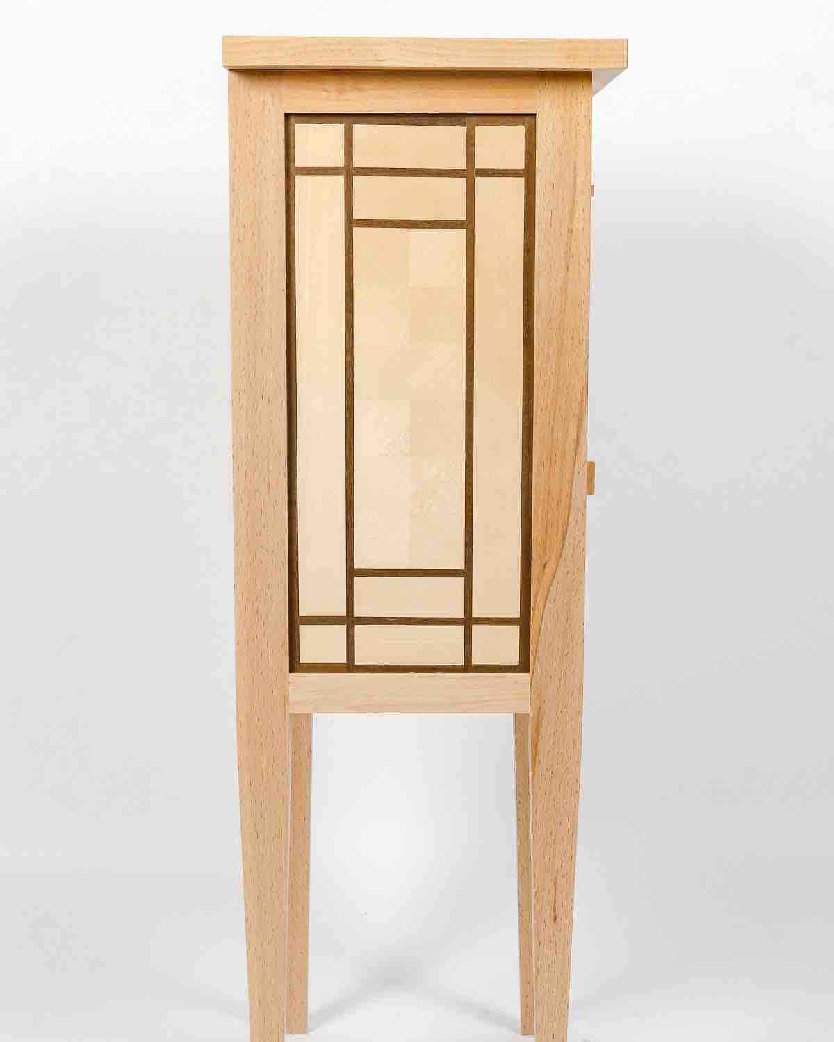 J’ai voulu apporter à ce chevet marqueté aux lignes simples et d’inspiration Louis XVI (pieds fuselés) une touche d’exotisme et lumineuse. Le motif de marqueterie rappelle ainsi les panneaux shoji qui structurent les espaces intérieurs japonais. Le travail sur le fil du bois du fond de marqueterie en érable permet un jeu de lumière créant un effet damier peu contrasté et élégant. La structure du meuble et du tiroir ainsi que les alaises du plateau sont en hêtre. Le plateau, les façades de la porte et du tiroir ainsi que les panneaux latéraux et arrière sont plaqués en érable et wengé. Le tiroir présente des assemblages à queues d’aronde réalisées à la main. Finition vernis mat.