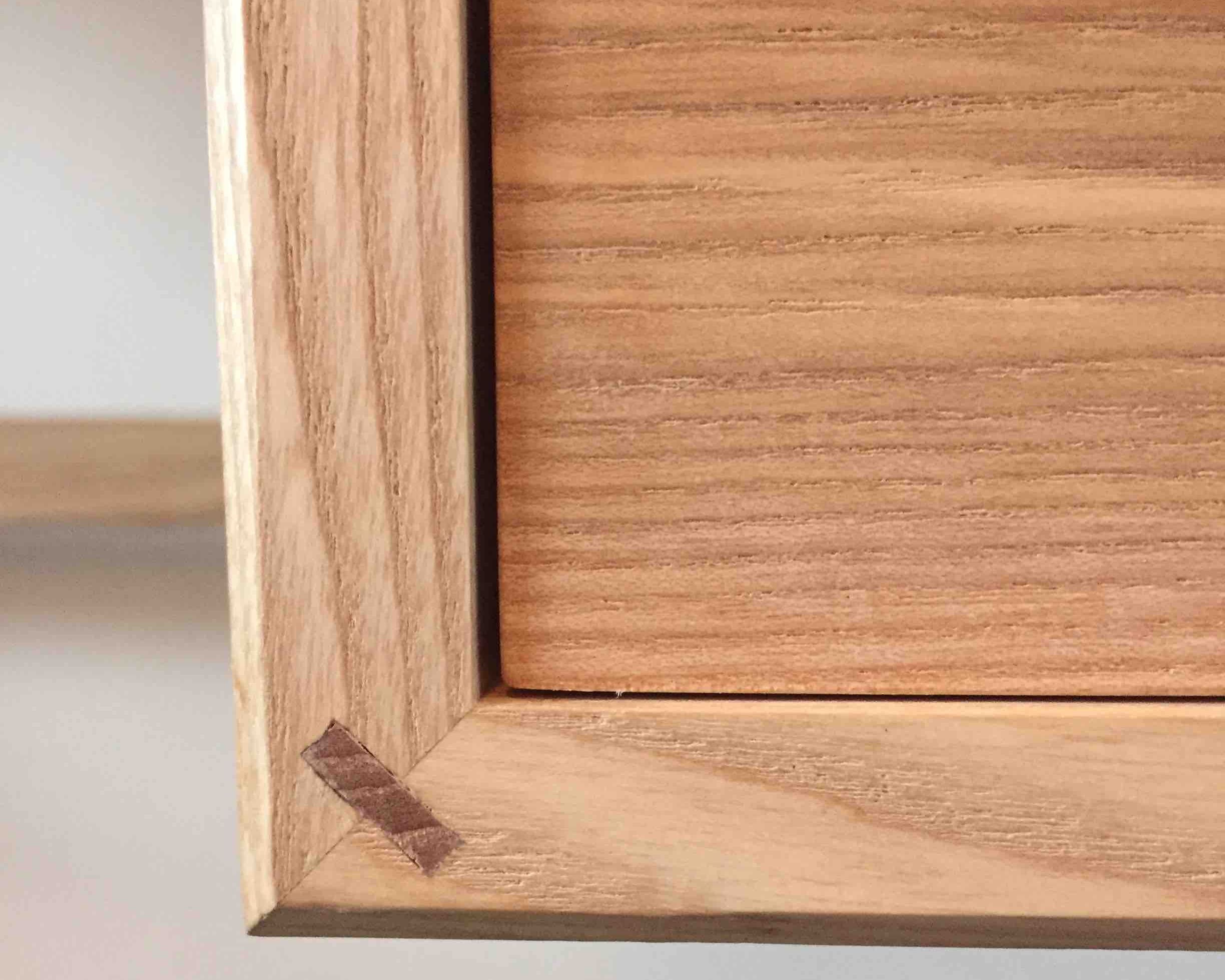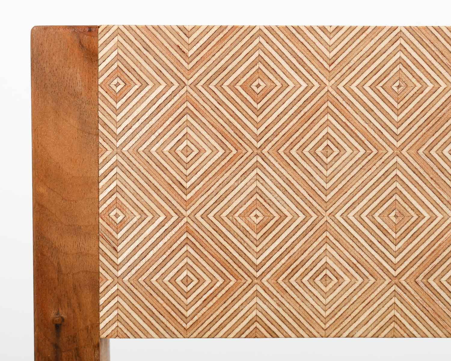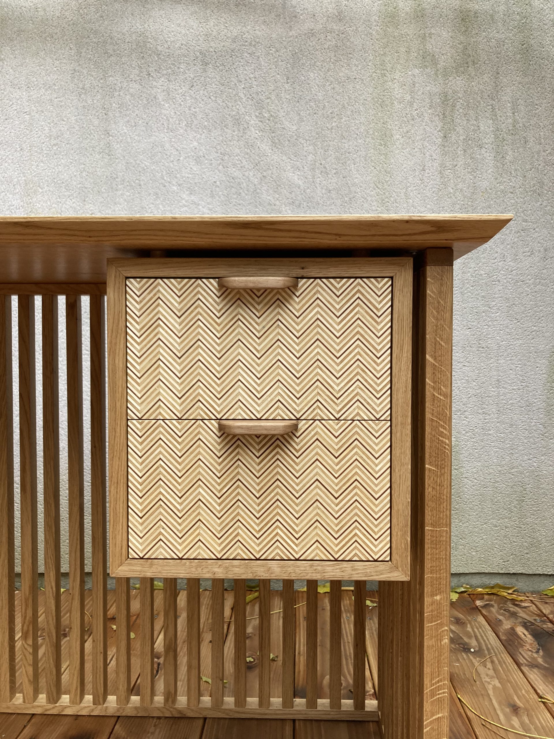 J’ai voulu apporter à ce chevet marqueté aux lignes simples et d’inspiration Louis XVI (pieds fuselés) une touche d’exotisme et lumineuse. Le motif de marqueterie rappelle ainsi les panneaux shoji qui structurent les espaces intérieurs japonais. Le travail sur le fil du bois du fond de marqueterie en érable permet un jeu de lumière créant un effet damier peu contrasté et élégant. La structure du meuble et du tiroir ainsi que les alaises du plateau sont en hêtre. Le plateau, les façades de la porte et du tiroir ainsi que les panneaux latéraux et arrière sont plaqués en érable et wengé. Le tiroir présente des assemblages à queues d’aronde réalisées à la main. Finition vernis mat.