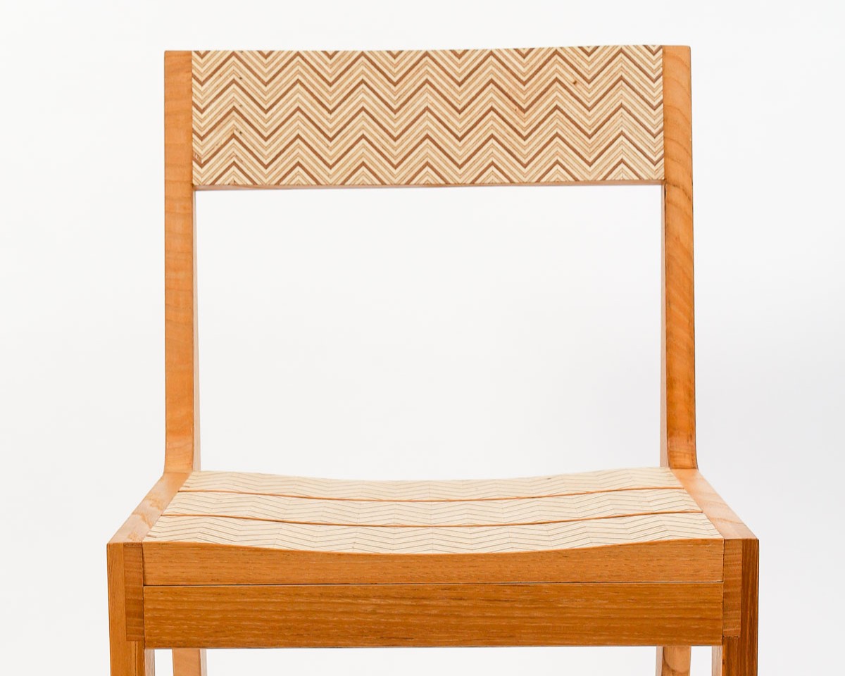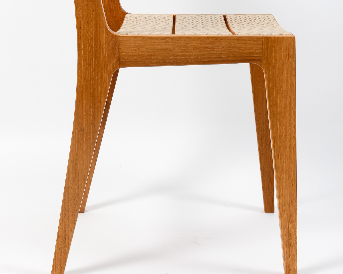 J’ai d’abord créé deux chaises… des sœurs jumelles. Ainsi est né le concept des chaises « Rochefort ». Après un travail sur la composition de placages contemporains réalisés à partir de panneau de contreplaqué, j’ai étoffé l’ensemble avec deux autres chaises.