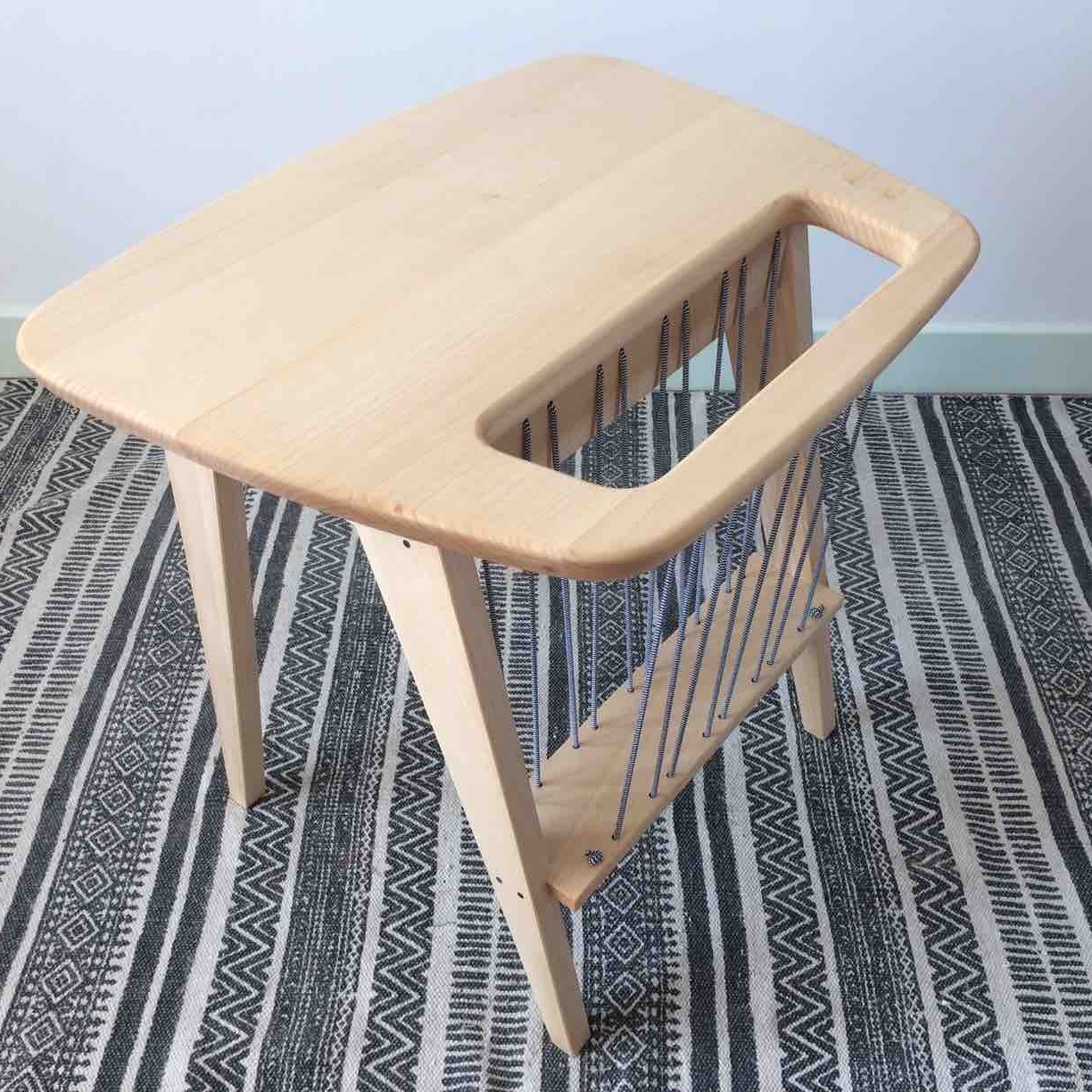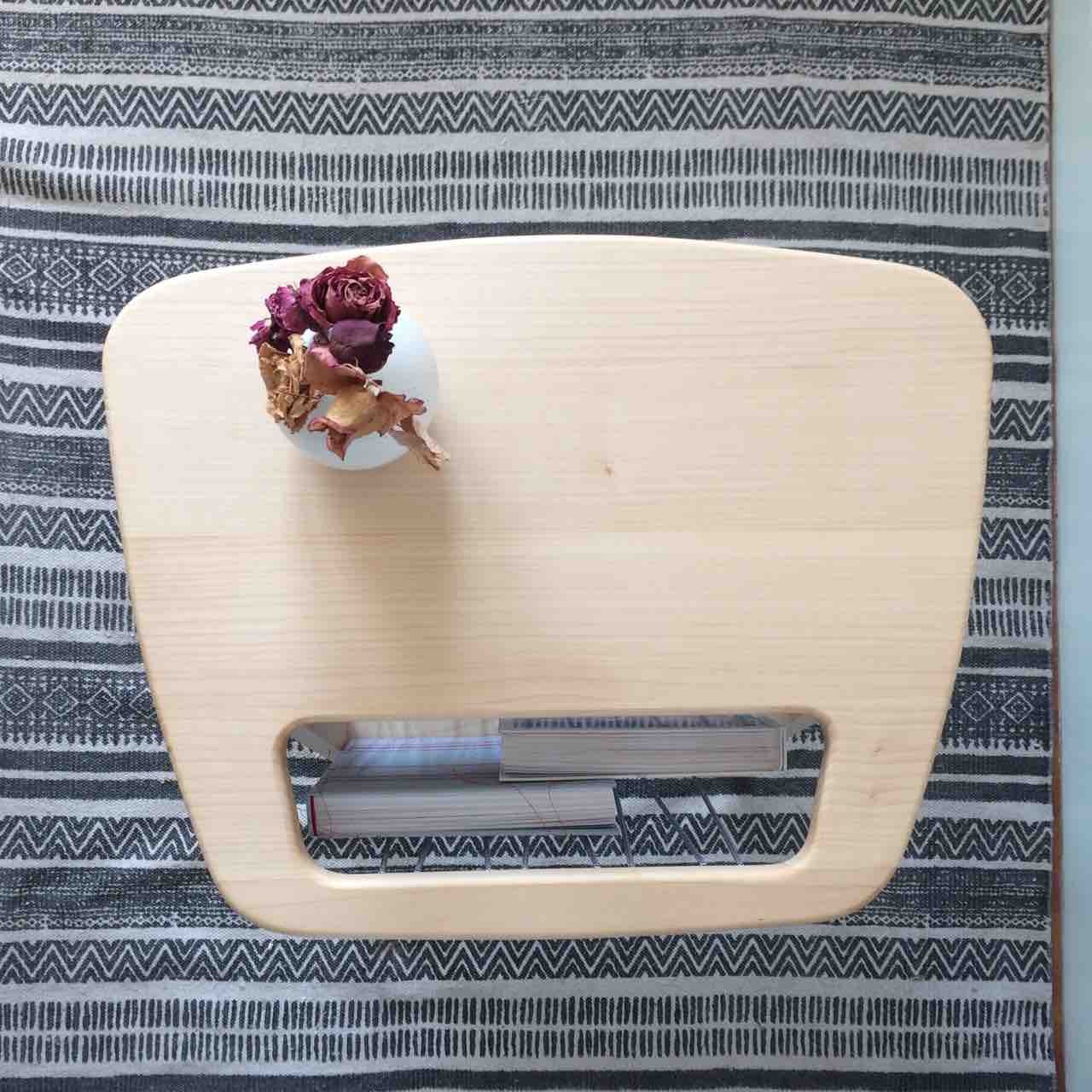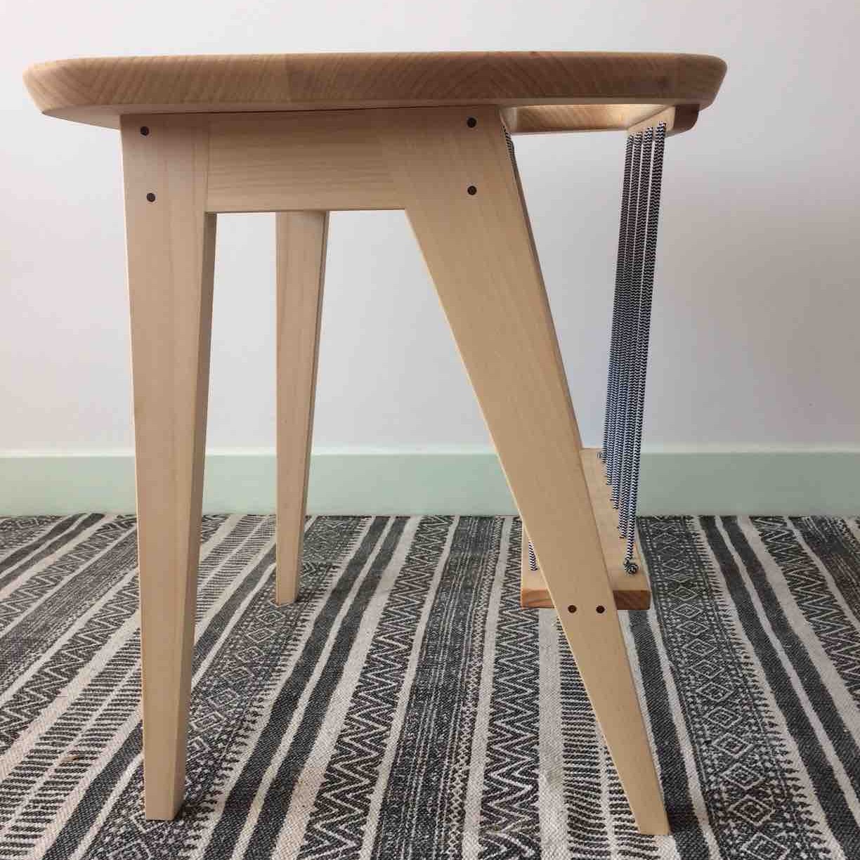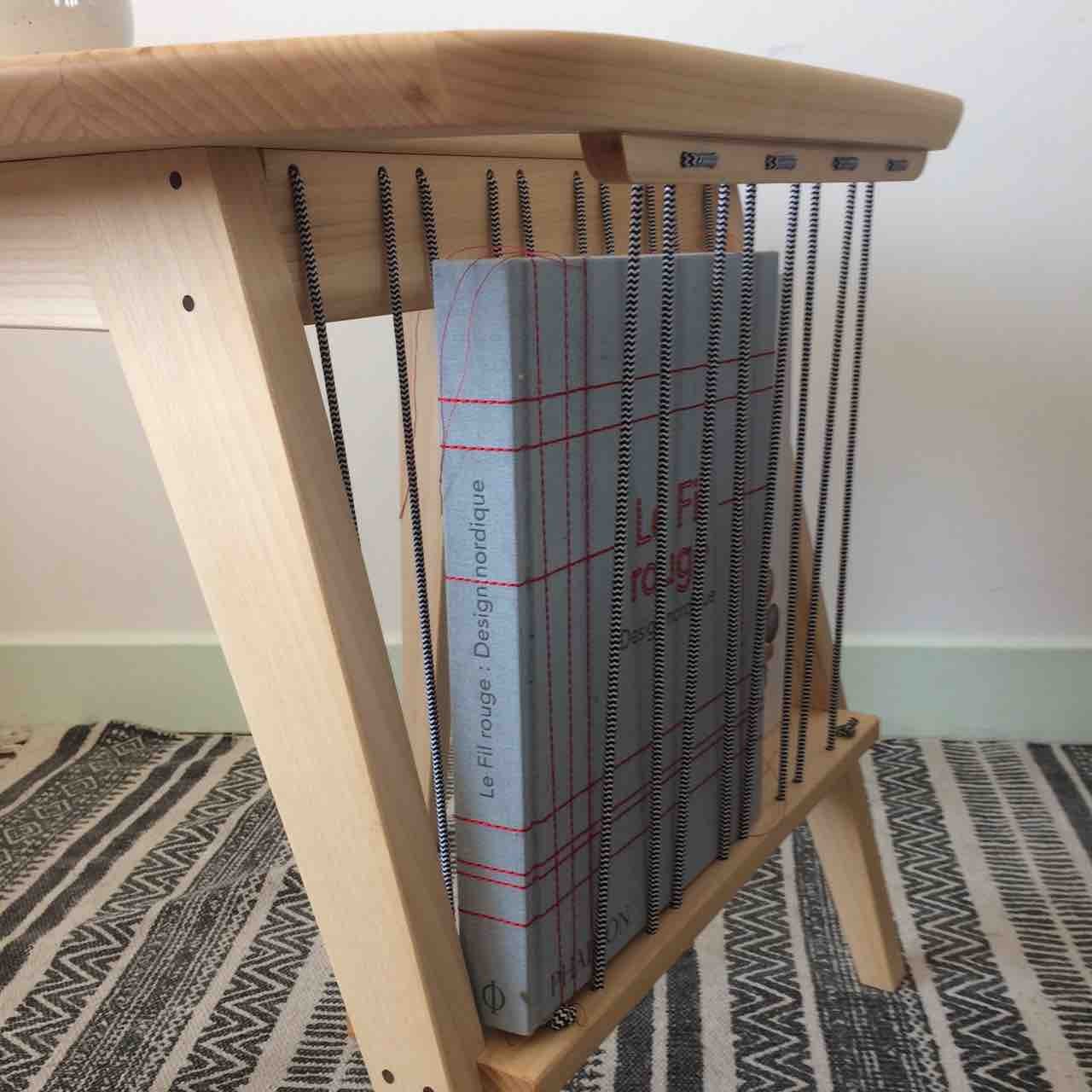 Cette petite table basse à magazines possède des lignes années 50 et m’a été inspirée d’un « bout de canapé » dessiné par Arthur Umanoff. Les pieds en compas (typiques de la période) et la forme du plateau ont été réinterprété. Cette table est en érable local et les assemblages ont été consolidés par des tourillons en noyer afin de créer un contraste pétillant. Cet effet est renforcé par l’utilisation d’un élastique à motif rayé permettant le maintien des magazines.
