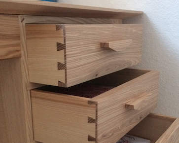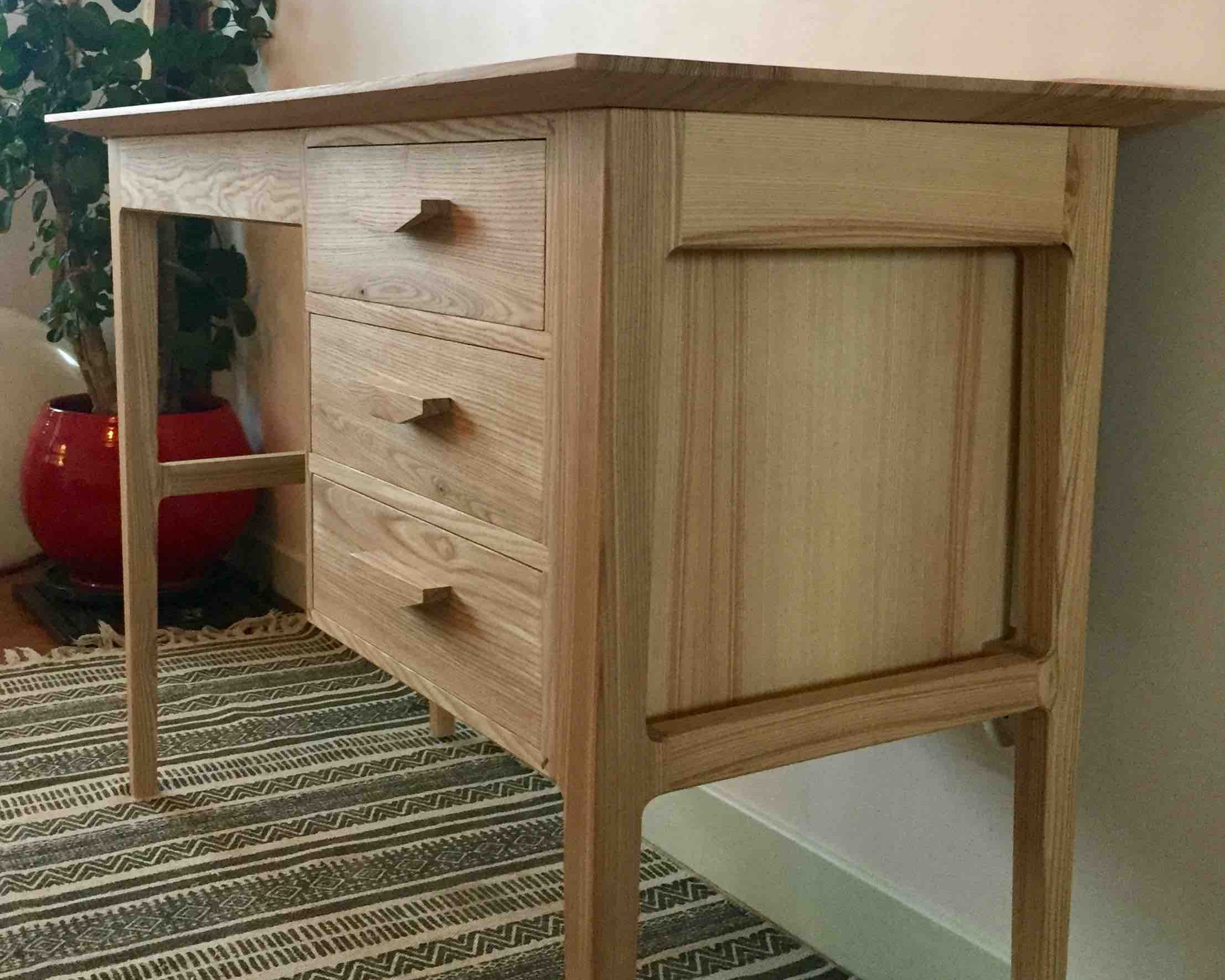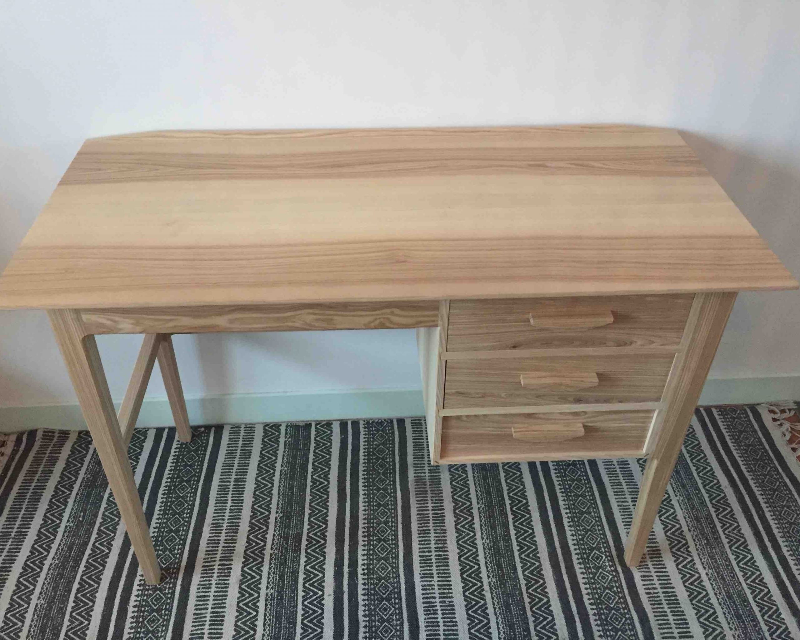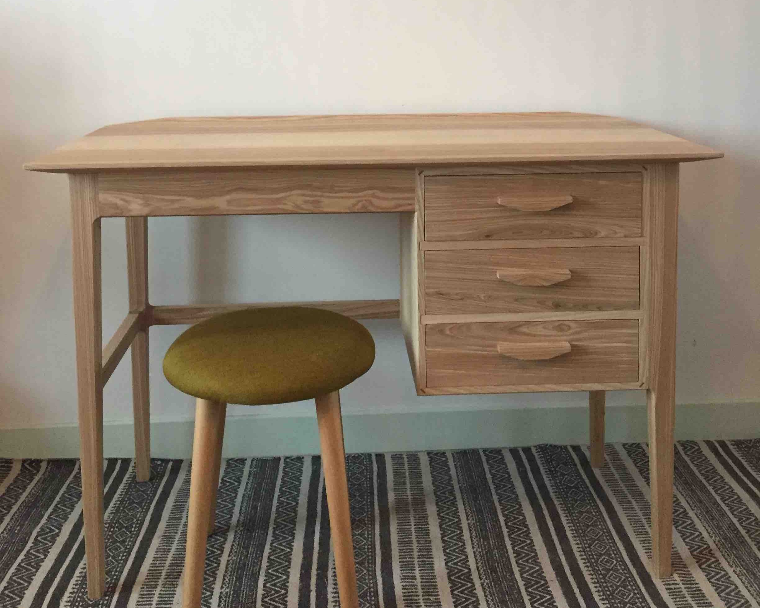 Ce bureau pour enfant a été conçu avec la volonté d’opposer la simplicité de ses lignes à la recherche du travail sur les assemblages, la forme du plateau, des poignées… Il comporte trois tiroirs présentant des assemblages à queues d’aronde réalisés à la main, des fonds de tiroir décorés de papier japonais. Les côtés et l’avant du plateau sont travaillés avec un biseau afin d’alléger sa silhouette ; l’arrière présente lui une baguette en ailette pour éviter aux objets déposés sur le bureau de glisser hors du plateau.