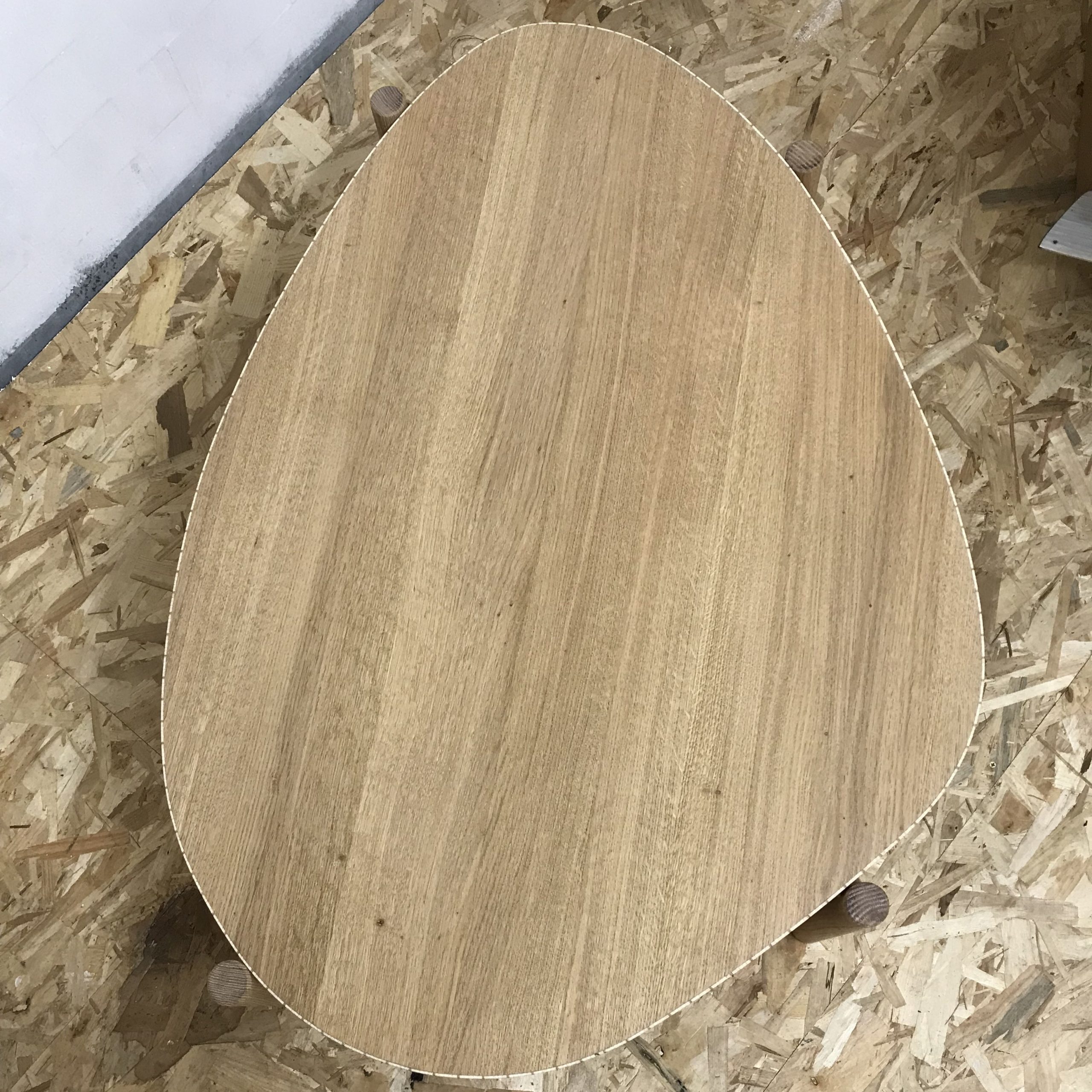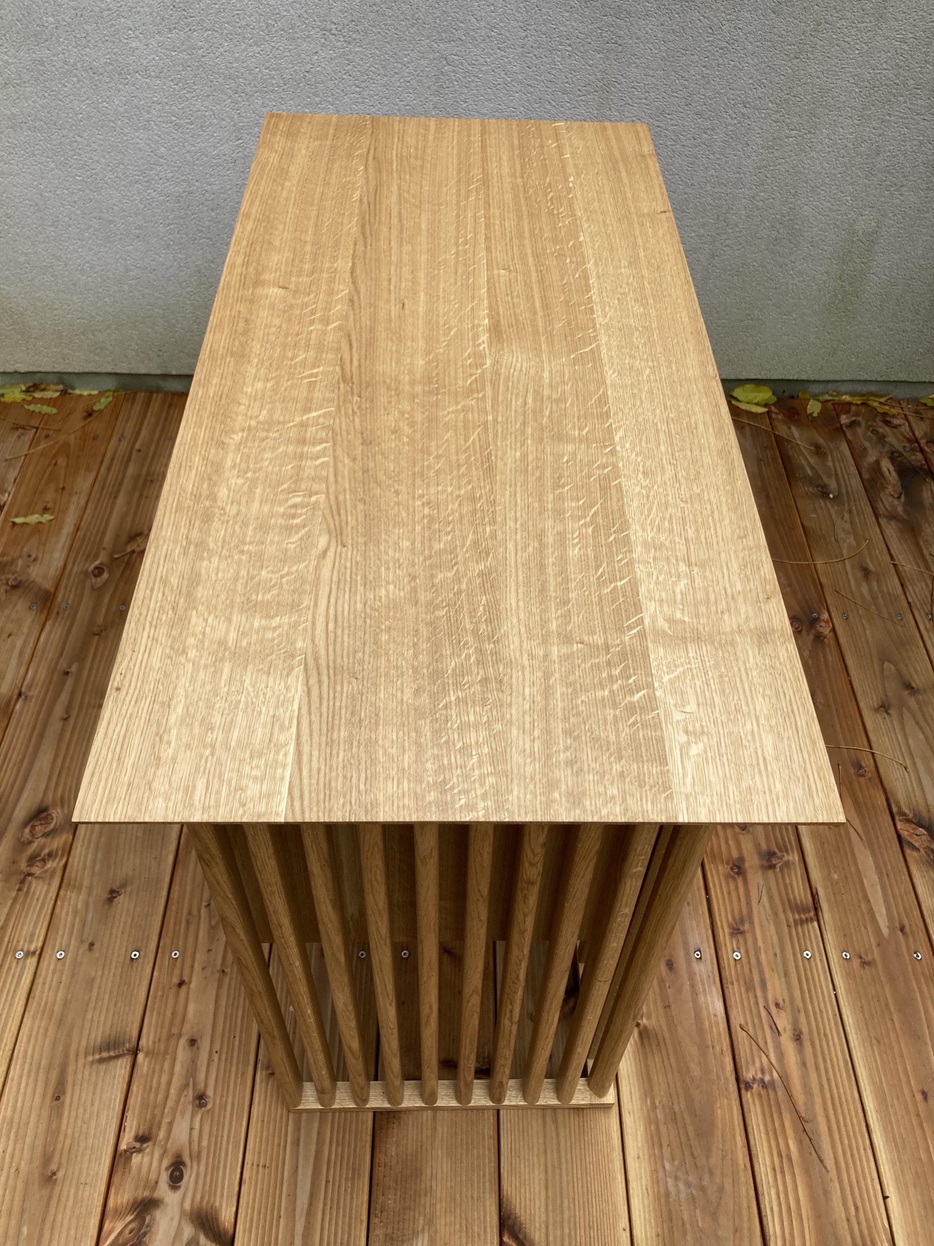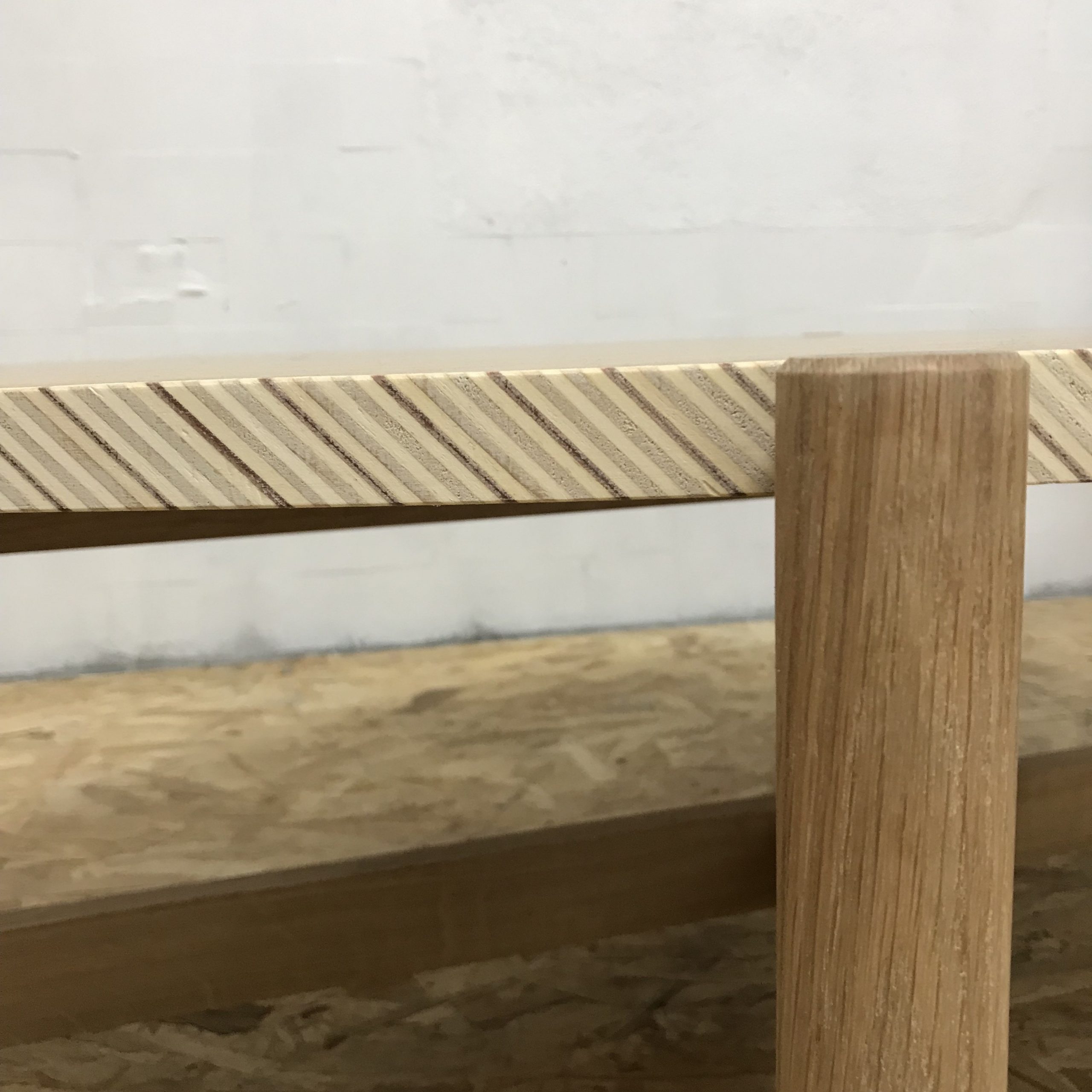 Le plateau est en chêne massif et son chant, unique et continu, est décoré avec un placage à motif créé avec du contreplaqué. Le piètement, également en chêne,