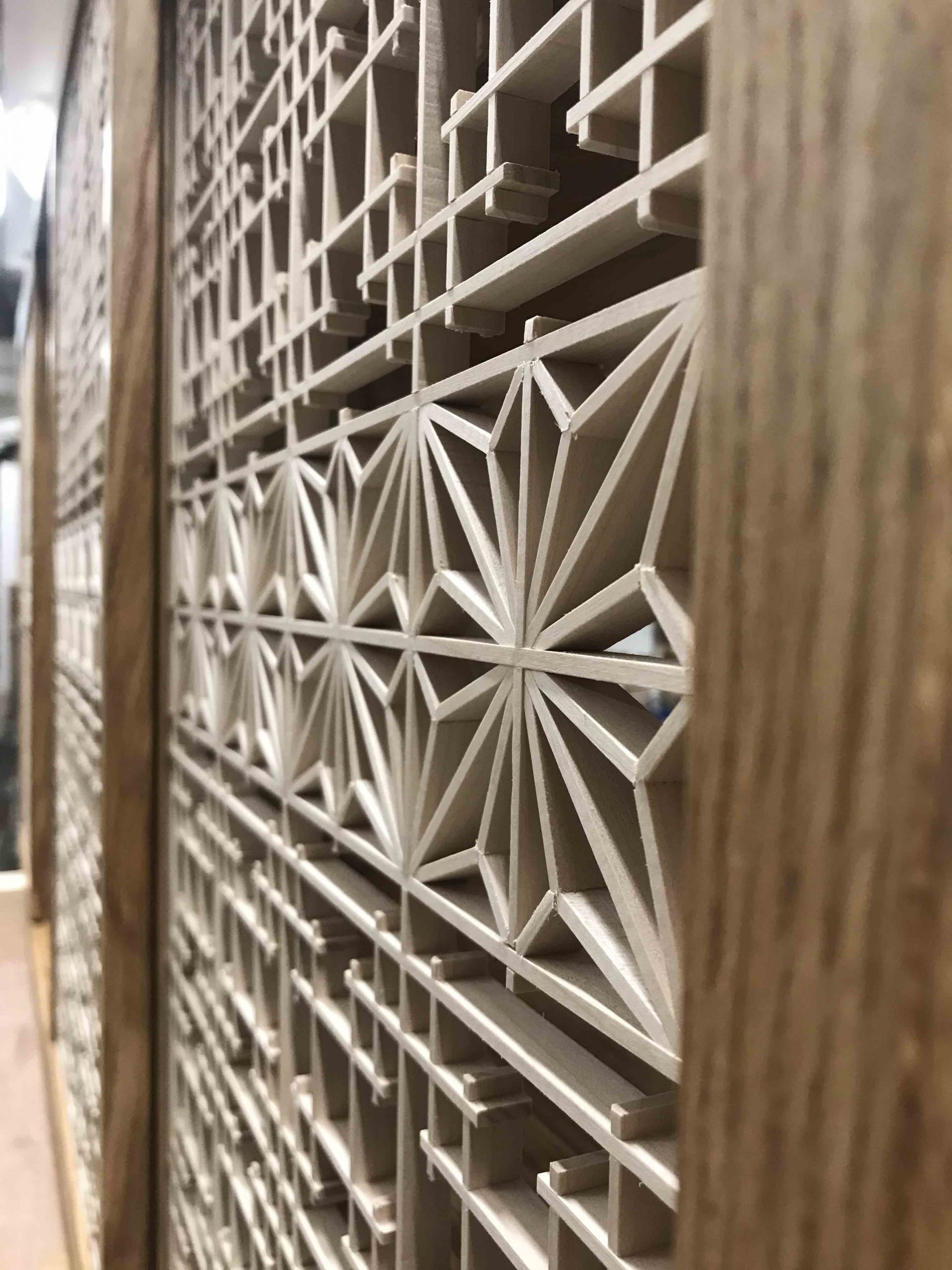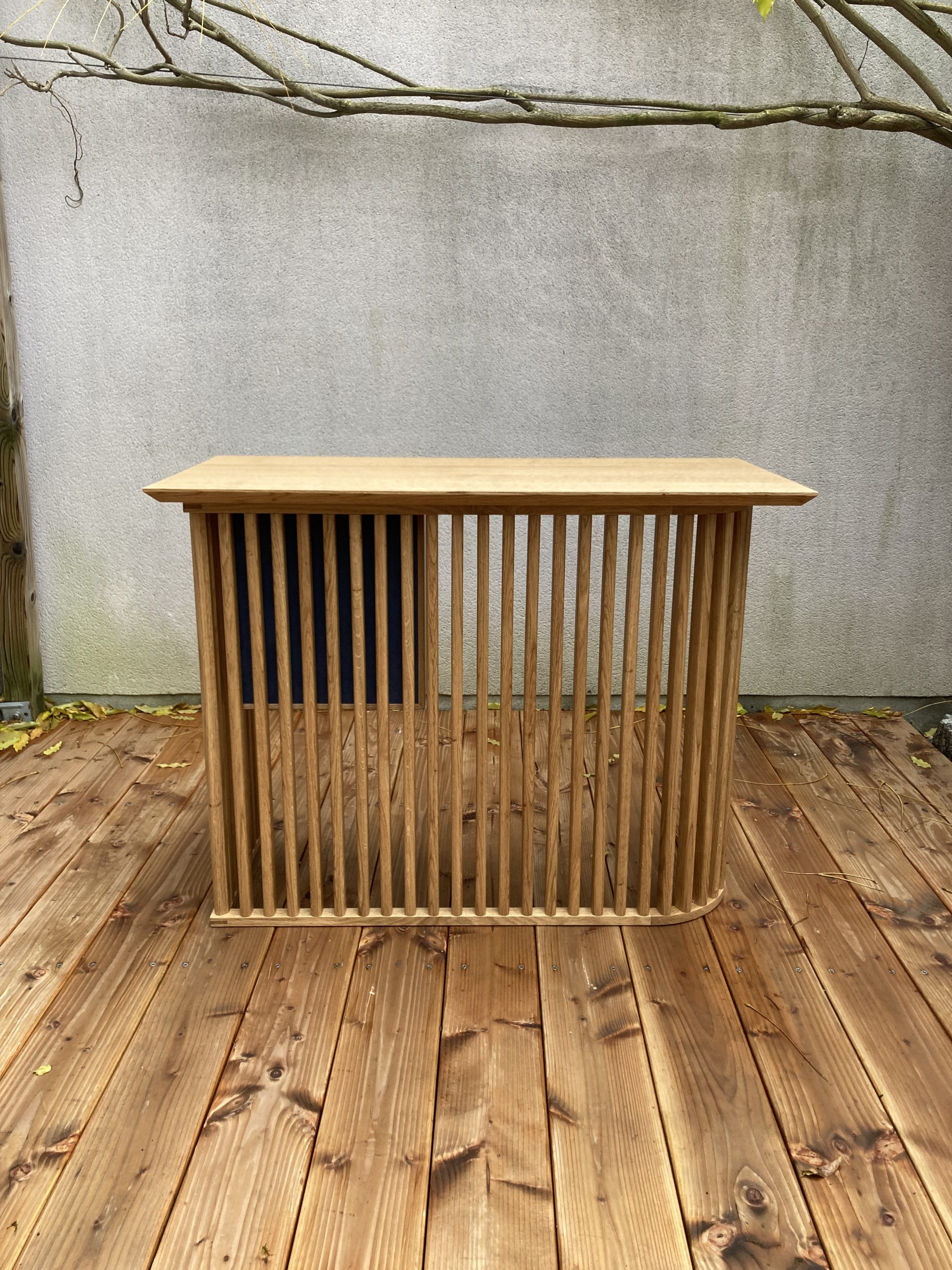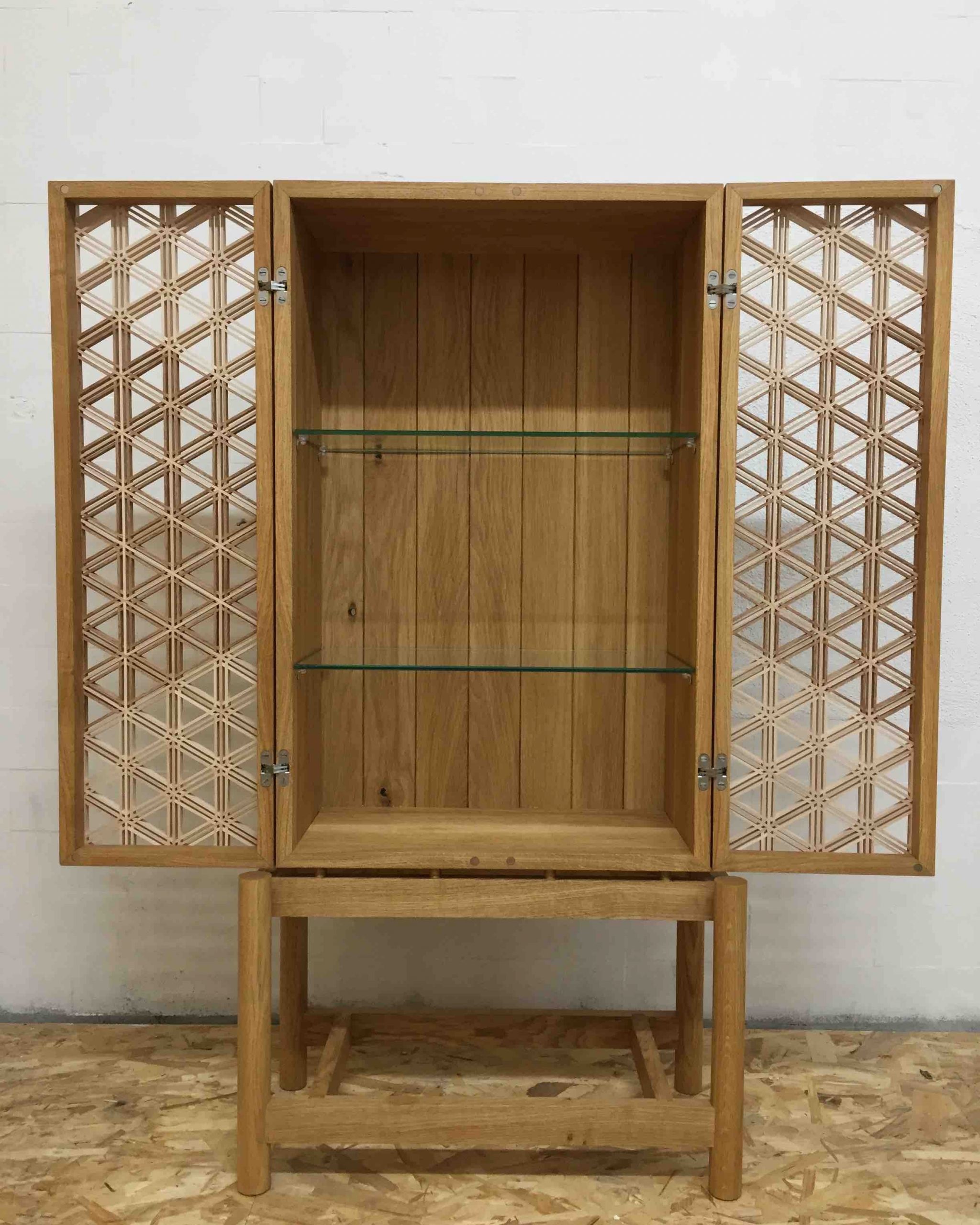 J’ai pensé ce meuble comme une vitrine-écrin, un véritable objet de décoration à part entière dont la fonction est aussi de mettre en valeur d’autres objets précieux. La partie haute en chêne est l’écrin à proprement parlé et dissimule des ouvrants élégamment ornés de poignées en noyer et d’un motif Kumiko nommé Goma réalisé en érable et padouk et qui représente la gousse de sésame.