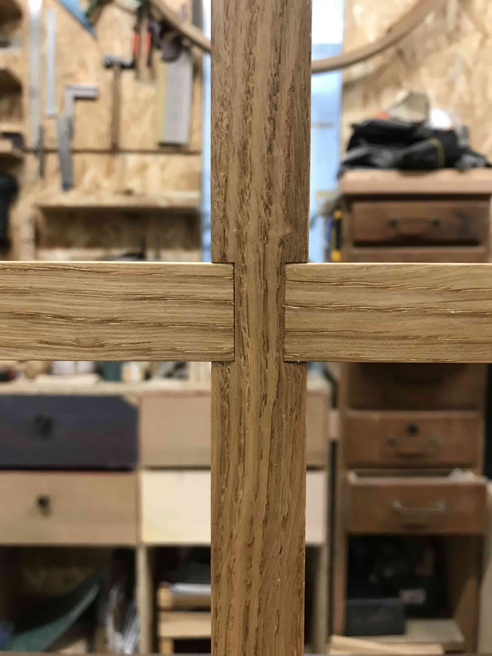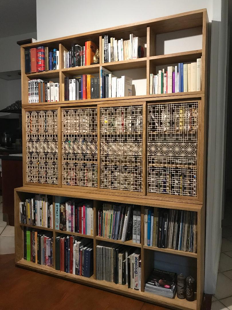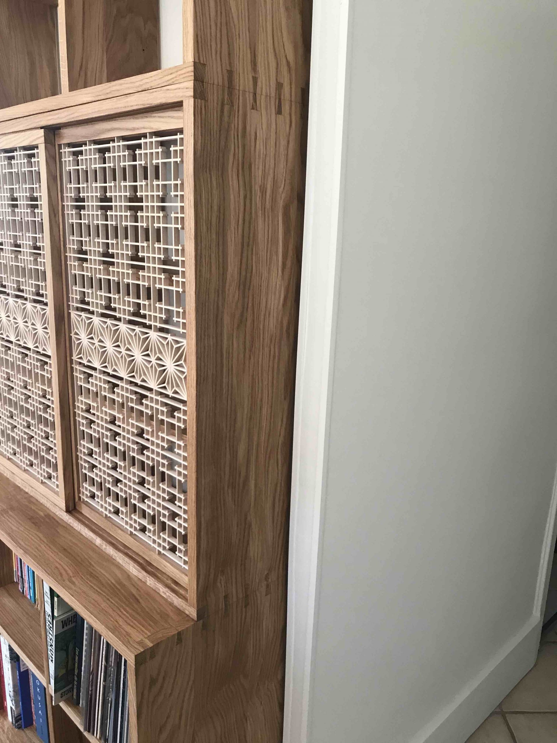 Cette bibliothèque entièrement réalisée dans un chêne de pays a été conçu en 3 modules dont le central comporte des portes coulissantes ornées d’un motif kumiko basé sur des lignes verticales et une frise AsaNoHa.Pour contrebalancer l’aspect très simple de la structure, une attention toute particulière a été portée aux assemblages à queues d’aronde multiples et la continuité du fil du bois sur les côtés des trois modules.