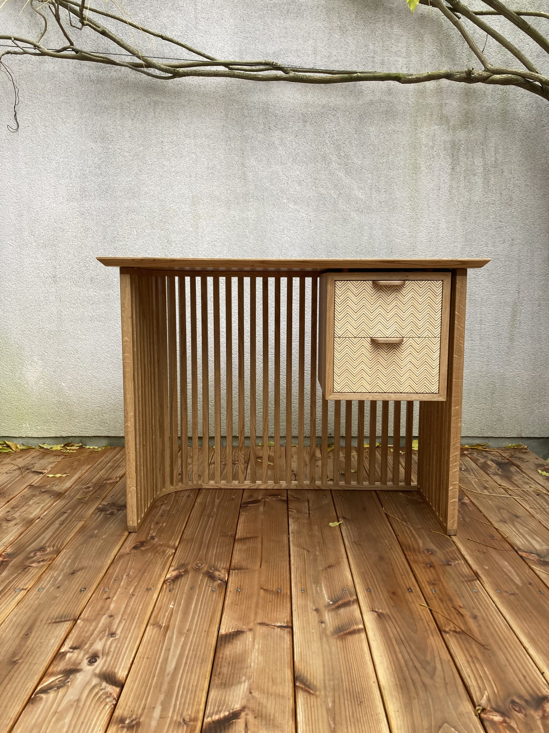 Le piètement de ce petit bureau se compose d’un claustra asymétique avec un coté arrondi enveloppant. Le plateau biseauté est tout en légèreté. Le bloc tiroir est comme détaché du reste du bureau pour mieux mettre en avant le placage contenporain des façades. Une silhouette qui a du caractère.